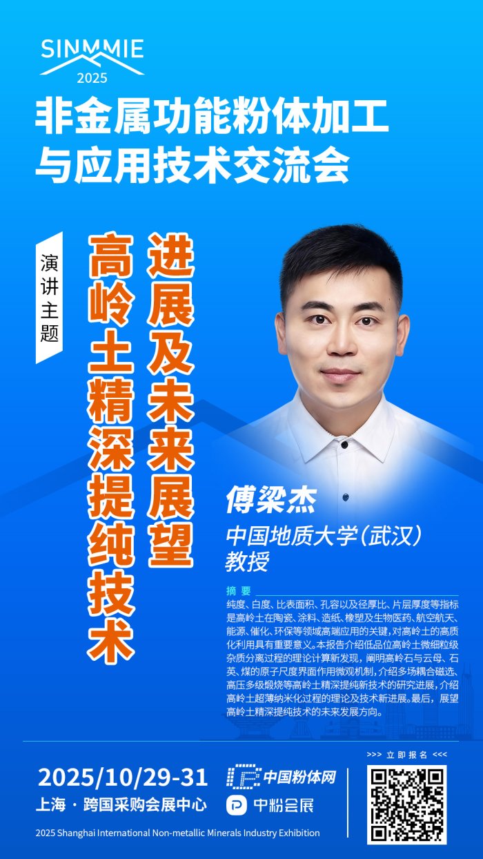 10月29-31日,北京粉體技術協會、柏德英思展覽(上海)有限公司、山東中粉會展服務有限公司將在上海跨國采購會展中心聯合主辦“上海國際非金屬礦工業展覽會(SINMMIE2025)”,展會現場將同期舉辦“非金屬功能粉體加工與應用技術交流會”,屆時將邀請中國地質大學(武漢)傅梁杰教授作《高嶺土精深提純技術進展及未來展望》專題報告,介紹低品位高嶺土分離技術,高嶺石與云母、石英、煤的原子尺度界面作用微觀機制,多場耦合磁選、高壓多級煅燒等技術的研究進展,高嶺土超薄納米化過程的理論及技術新進展等。