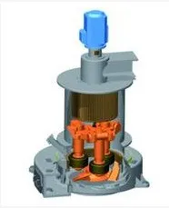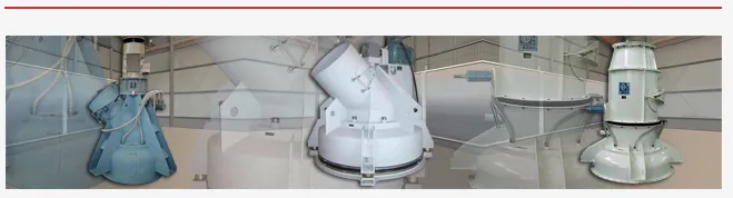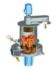 原料通過氣力輸料管道被輸送至研磨區。大部分氣流從磨盤下方的主風道入口進入研磨機,磨盤以70至120m/s線速度進行旋轉。通過分級輪的速度來進行調節產品的研磨細度。符合粒徑要求的產品通過分級機被分離出去,更大物料顆粒會被彈回并重新研磨。細粉在位于研磨機后方的旋風分離器/除塵器中從空氣中被過濾收集。
