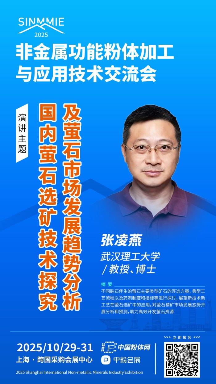 10月29-31日,北京粉體技術協會、柏德英思展覽(上海)有限公司、山東中粉會展服務有限公司將在上海跨國采購會展中心聯合主辦“上海國際非金屬礦工業展覽會(SINMMIE2025)”,展會現場將同期舉辦“非金屬功能粉體加工與應用技術交流會”,屆時將邀請武漢理工大學張凌燕教授作《國內螢石選礦技術探究及螢石市場發展趨勢分析》主題報告,分析國內螢石資源現狀和特征,對不同脈石伴生的螢石主要類型礦石的浮選方案、典型工藝流程以及藥劑制度和指標等進行探討,展望新技術新工藝在螢石選礦中的應用。同時對螢石精礦市場發展態勢開展分析和預測,為螢石資源的高效開發提供基礎性信息。