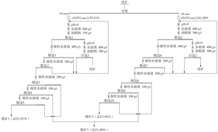 石英型螢石礦:常用一段粗磨粗選—粗精礦再磨—多次精選的工藝流程。