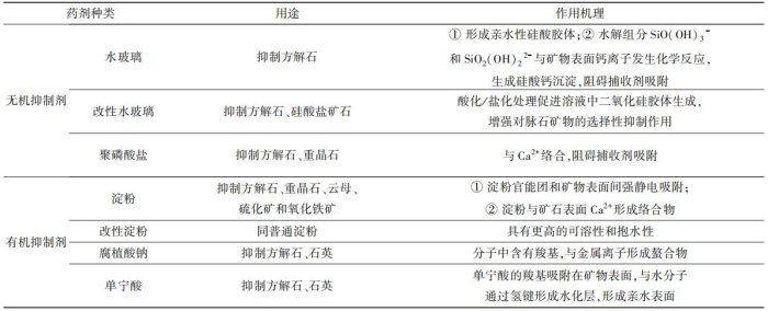 含鈣礦物(螢石、方解石)表面具有相似的Ca2+離子活性位點、溶解性、表面電荷,與傳統脂肪酸類捕收劑具有相近的反應活性。因此,需要選擇性地抑制脈石礦物,使其表面更加親水,增大脈石礦物與目的礦物顆粒之間的表面性質差異,最終實現分離。螢石浮選中的抑制劑大致可分為兩類,即無機抑制劑和有機抑制劑。