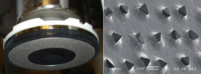 在CMP(化學(xué)機械拋光)工藝中,拋光墊本身不斷被拋光而變得光滑,使用過的拋光液以及在拋光過程中產(chǎn)生的廢棄物會沉積在拋光墊的表面,這就需要使用修整盤對拋光墊進行修整再生,重新塑造拋光墊的表面粗糙度,恢復(fù)使用性能。修整可以清除堵塞小孔的碎屑和微粒,去除拋光墊的釉面,使拋光墊得到重生,獲得所需的粗糙度和多孔性。此外,修整還可以減少更換拋光墊的次數(shù),節(jié)省使用新拋光墊所需的重新調(diào)整校正到穩(wěn)定的步驟和時間,從而大大提高CMP工藝的穩(wěn)定性。