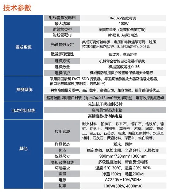 1、同時分析測量多種元素(從 Na到U的任意多種元素);分析濃度范圍:1ppm-100%;
