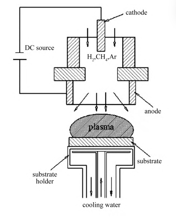 據百色學院劉建設、河南黃河旋風汪曙光、鄭州輕工業大學王良文等撰文介紹,直流電弧等離子體噴射法(DC Arc-jet Plasma CVD)是通過高功率直流電弧放電,將以CH4-H2-Ar為主要成分的反應氣體激發形成等離子體,并將其高速噴射到襯底表面后沉積形成金剛石膜。