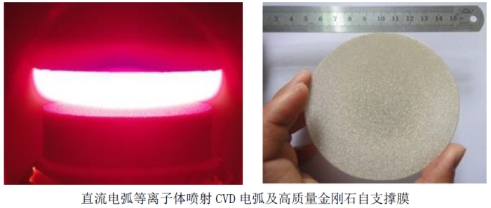 北科大采用高功率DC Arc Plasma Jet CVD系統制備大面積光學級金剛石自支撐膜在國內外率先取得成功。研究組已在國內外學術刊物發表相關研究論文300多篇,獲得專利20多項。曾獲北京市科技進步二等獎和全國發明展覽會金獎。近年來,已經有上百臺套DC Arc Plasma Jet CVD系統在大專院校、研究院所和企業運行,已經成為CVD金剛石膜研究和工業生產的主要技術之一。由此也確立了高功率直流電弧等離子噴射法作為制備金剛石膜材料重要的方法之一的地位。