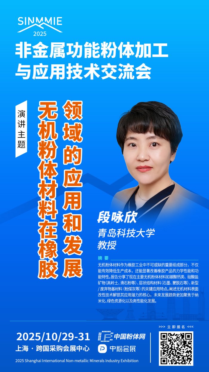10月29-31日,北京粉體技術協會、柏德英思展覽(上海)有限公司、山東中粉會展服務有限公司將在上海跨國采購會展中心聯合主辦“上海國際非金屬礦工業展覽會(SINMMIE2025)”,展會現場將同期舉辦“非金屬功能粉體加工與應用技術交流會”,屆時將邀請青島科技大學段詠欣教授作《無機粉體材料在橡膠領域的應用和發展》專題報告,分享主流無機粉體材料如碳酸鈣類、硅酸鹽礦物(高嶺土、滑石粉等)、層狀結構材料(石墨、蒙脫石等)、新型/廢棄物基材料(粉煤灰等)在橡膠材料中的應用技術和發展趨勢。