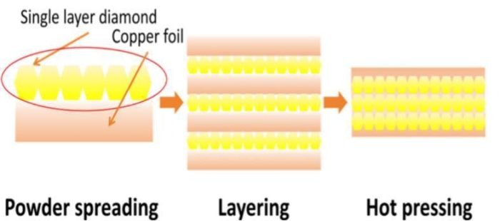 此前,哈爾濱工業大學朱嘉琦、曹文鑫團隊提出的高溫層壓工藝可實現極高的尺寸精度,與傳統熱壓工藝相比,該工藝操作更簡便且制造成本更低,可解決表面光潔度差、尺寸精度低及性能問題。主要是采用鎢涂層金剛石和銅片作為原料,將鎢涂層金剛石置于銅片上,分層后進行熱壓。該工藝利用銅金屬在高溫下具有高塑性和低流動應力的特性,使銅填充金剛石顆粒間的孔隙并使板材致密化。