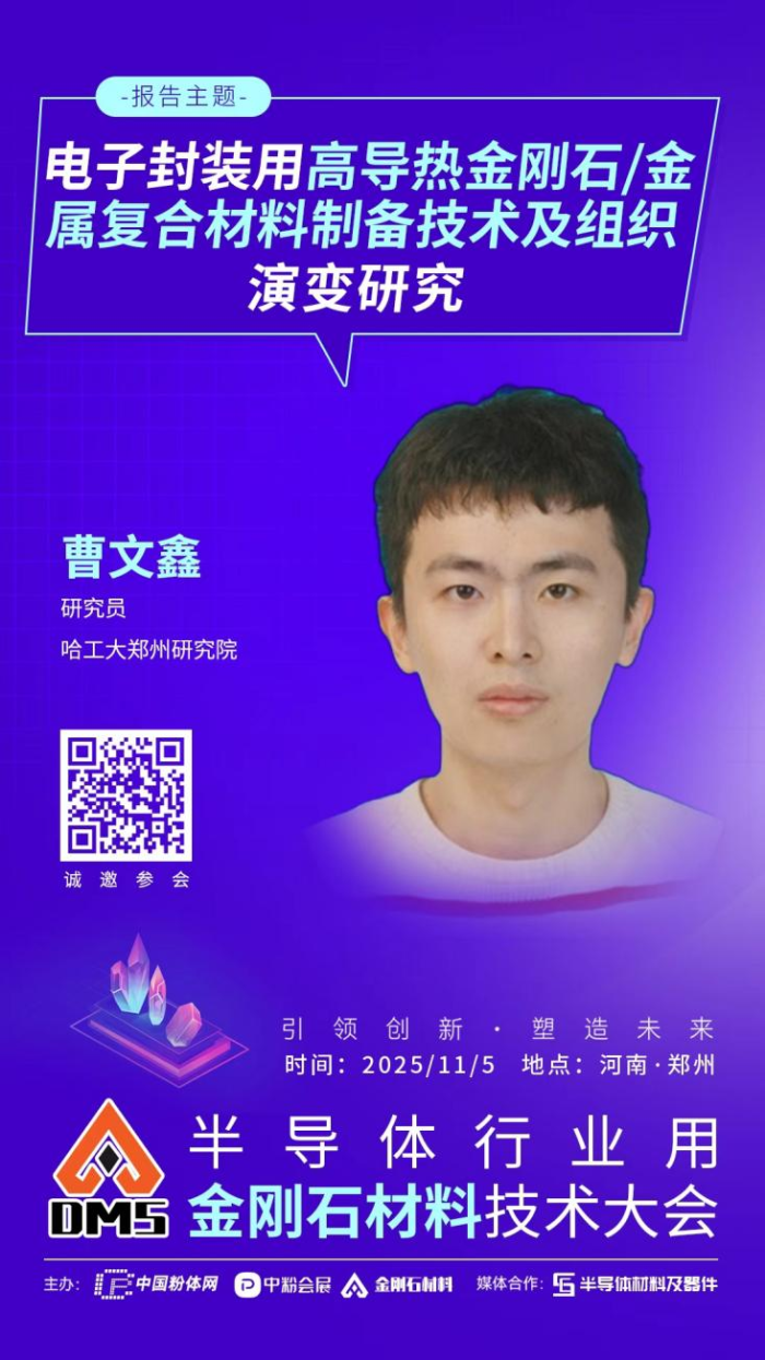 2025年11月5日,中國粉體網將在河南•鄭州舉辦“2025半導體行業用金剛石材料技術大會”。屆時,我們邀請到哈工大鄭州研究院曹文鑫研究員出席本次大會并作題為《電子封裝用高導熱金剛石/金屬復合材料制備技術及組織演變研究》的報告。報告將圍繞高導熱金剛石/金屬復合材料,闡述金剛石鎢鍍層制備、結構機制及創新性高溫層壓工藝,為高熱導率復合材料開發提供理論與技術支撐。