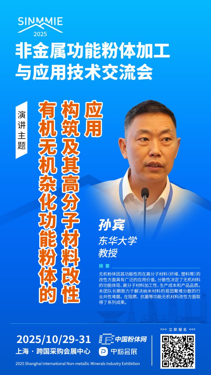 10月29-31日,北京粉體技術協(xié)會、柏德英思展覽(上海)有限公司、山東中粉會展服務有限公司將在上海跨國采購會展中心聯(lián)合主辦“上海國際非金屬礦工業(yè)展覽會(SINMMIE2025)”,展會現場將同期舉辦“非金屬功能粉體加工與應用技術交流會”,屆時將邀請東華大學孫賓教授作《有機無機雜化功能粉體的構筑及其高分子材料改性應用》專題報告,分析無機粉體在高分子材料中的改性技術、應用價值,介紹團隊在阻燃、抗菌等方面取得的研究成果。