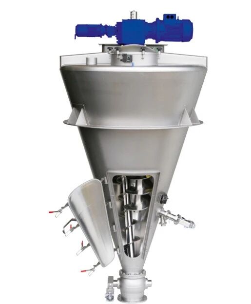 NAUTA® 錐形螺旋混合機是一種混合效率很高的對流混合機。其混合方式為柔性,既能確保較高的混合效率,也能保證無產品變形。螺桿平均轉速為70rpm,同時轉臂以1至2rpm轉速旋轉。螺旋葉尖轉速在0.5和2m/s之間波動,適用于所有ATEX區域。旋轉懸臂式混合螺旋可將產品從容器底部傳遞至產品表面。混合螺旋懸置于軌道懸臂上,沿錐形容器內壁旋轉,從而實現顆粒和切粒的對流混合。當顆粒由于重力作用在錐形容器中再循環時,降低容器直徑可提高向下質量流中顆粒的速度。這些同步作用實現了快速、高強度混合效果,且功率消耗低、混合精度高。
