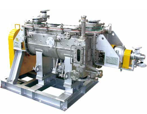 盤式干燥機由一個固定的水平容器組成,帶有加熱/冷卻套,提供一個管狀轉子垂直安裝雙壁圓盤。由于加熱介質(冷卻介質)熱水、蒸汽或熱油(工業水、冷卻水或冷卻介質)可導流到導管架和轉子上。蒸汽介質盤形轉子的結構與熱油不同。在蒸汽介質的情況下,冷凝是由滴管沿圓盤的旋轉拾取,并連續排放。熱油加熱時,它進入轉子軸的一端,穿過每個盤,從軸的另一端出去。在任何一種介質(蒸汽/油)中,干燥機的構造方式是將每個圓盤均勻加熱,溫度分布均勻。