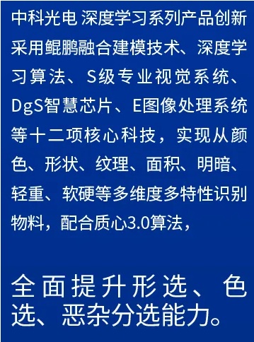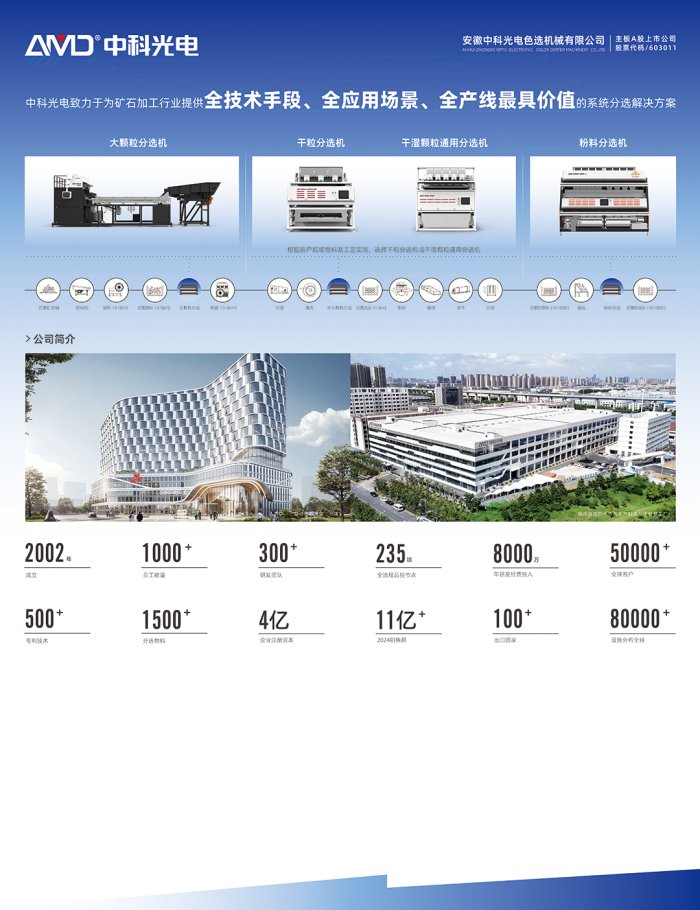 安徽中科光電色選機械有限公司坐落于中國合肥,占地面積15萬平方米,總投資4.5億,員工人數760多人,科研樓25000平方米,是一家專業從事智能分選設備研發、生產、銷售的高新技術企業。歷經十多年的發展,已成為擁有員工超600人,銷售收入逾5億元的大型智能分選設備生產基地。 公司全面通過了質量管理體系認證、環境管理體系認證、職業健康管理體系認證,“安美達”系列產品通過了歐盟CE認證。嚴格的質量管理體系保障了公司產品和服務的質量,在全國乃至世界打響了“安美達”品牌。“色選,我們無處不在”是中科光電對于色選技術的追求和承諾。“安美達”牌系列智能色選機市場份額位列三甲,并成功遠銷一百多個國家和地區。 公司成立專門研發中心并被認定授予“安徽省企業技術中心”和“博士后科研工作站”,且與合肥工業大學共建智慧辨識與分揀工程技術中心。先后獲得自主知識產權近48項,高新技術產品6項,并參與制定3項安徽省地方標準。“安美達”品牌被認定為“中國馳名商標”、“安徽省著名商標”。公司先后被認定為“國家高新技術企業”、“安徽省知識產權優勢企業”、“合肥市知識產權示范企業”、“合肥市兩化融合示范企業”、“合肥市創新型企業”。