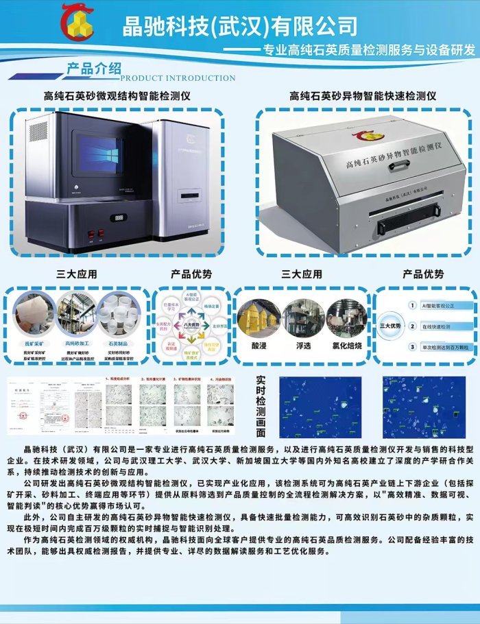 晶馳科技(武漢)有限公司是專注于高純石英質(zhì)量檢測領(lǐng)域的科技型企業(yè),集檢測技術(shù)服務(wù)、智能化檢測儀器研發(fā)與銷售于一體。公司總部坐落于湖北省武漢市洪山區(qū)——這座被譽(yù)為"中國大學(xué)之城"的創(chuàng)新高地,依托區(qū)域豐富的高校人才資源和四通八達(dá)的交通網(wǎng)絡(luò),為企業(yè)發(fā)展注入強(qiáng)勁動(dòng)能。