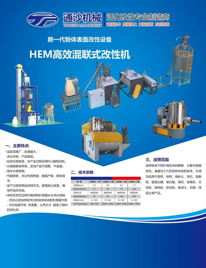 公司研發了新型HEM高效混聯式改性機,產品質量穩定提高,操作簡單,節能降耗效果顯著。另有GX-10至GX-1300小型至大型粉體表面改性機。適用于各種生產能力及各種粉體種類。包括:輕(重)質碳酸鈣、高嶺土、重晶石、滑石、長石、石墨、葉蠟石、水鎂石、硅藻土、氧化鋁、氫氧化鋁、氧化鎂、氧化鋅、硅微粉、硅灰石、黑硅石、沸石等。經過幾年的潛心開發與研究,生產設備得到進一步的完善,目前已成為粉體深加工生產的設備廠家。
