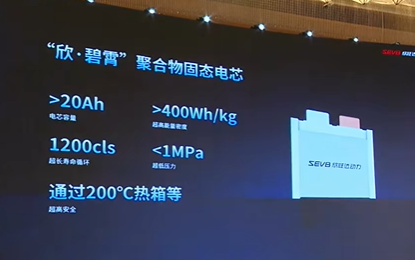 中國粉體網訊 10月23日,欣旺達推出新一代聚合物全固態電池“欣·碧霄”,電芯容量達20Ah,能量密度達400Wh/kg,在<1MPa的超低外加壓力下循環壽命1200周,通過200℃熱箱等安全測試。