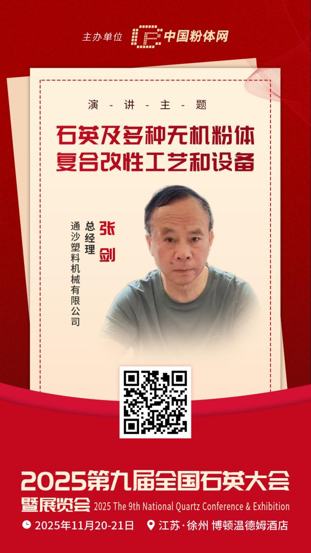 2025年11月20-21日,中國粉體網將在江蘇徐州舉辦“2025(第九屆)全國石英大會暨展覽會”。屆時,通沙塑料機械有限公司總經理張劍,將帶來題為《石英及多種無機粉體復合改性工藝及設備》的報告。他將用多年實戰經驗拆解技術難點,用創新設備方案破解生產痛點,助力行業同仁共探石英及多種無機粉體復合改性高端化發展新路徑!