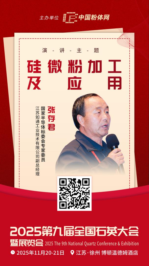 為了更深入地探討硅微粉加工技術的創新方向與應用領域的拓展潛力,2025年11月20-21日,中國粉體網將在江蘇徐州舉辦“2025(第九屆)全國石英大會暨展覽會”。屆時,國家半導體標委會專家委員、江蘇如通工業技術有限公司副總經理張存君,將帶來題為《硅微粉加工及應用》的報告。他將結合自身深耕硅微粉領域的豐富經驗,解讀硅微粉加工及應用等相關內容,助力推動硅微粉產業的高質量發展。
