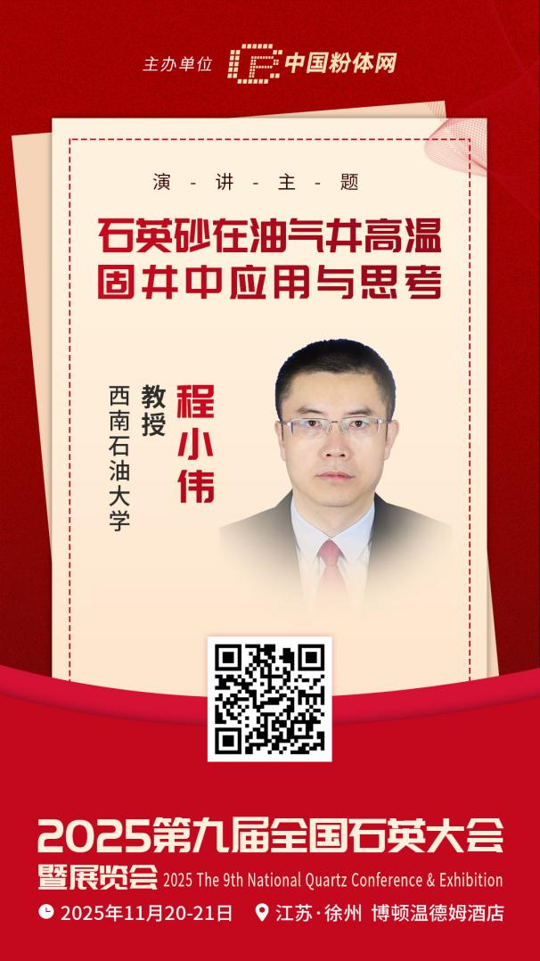 2025年11月20-21日,由中國粉體網主辦的“2025第九屆全國石英大會暨展覽會”將在江蘇徐州召開,西南石油大學程小偉教授將帶來題為《石英砂在油氣井高溫固井中應用與思考》的報告,屆時,他將深入分享石英砂在該領域的應用經驗及未來發展方向。