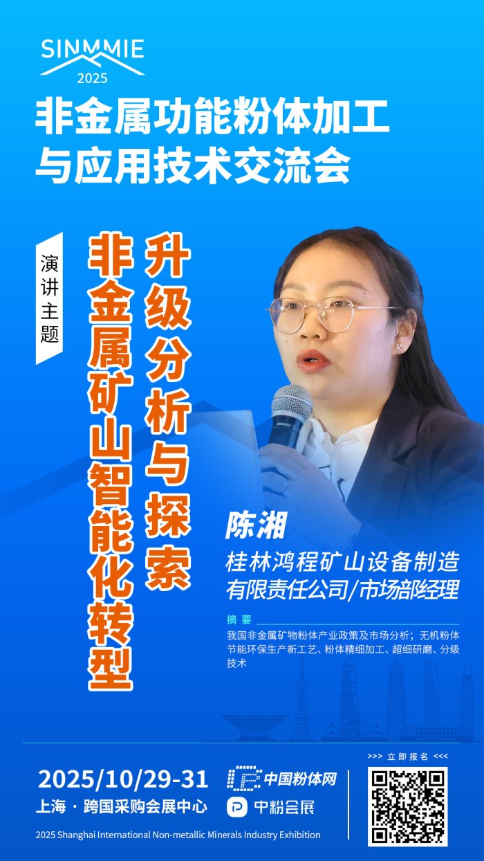 我國礦物加工自動化研究與應用相較于國外起步晚,但經過近年來的技術進步以及企業對生產效率的要求,自動化技術與智能控制技術已經應用在礦物加工的各個環節。10月29-31日,北京粉體技術協會、柏德英思展覽(上海)有限公司、山東中粉會展服務有限公司將在上海跨國采購會展中心聯合主辦“上海國際非金屬礦工業展覽會(SINMMIE2025)”,展會現場將同期舉辦“非金屬功能粉體加工與應用技術交流會”,屆時將邀請桂林鴻程礦山設備制造有限責任公司市場部經理陳湘作《非金屬礦山智能化轉型升級分析與探索》專題報告,分享無機粉體節能環保生產新工藝、粉體精細加工技術、超細研磨技術、分級技術。