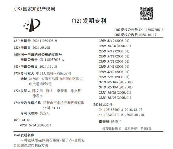 中鋼天源此次獲得的專利技術,正是精準瞄準了這一行業共性痛點。該技術摒棄了傳統涂層附著力弱、致密性不足、耐久性差的工藝路線,創新性地構建了“石墨烯-量子點-金屬”三元協同的復合防護體系。