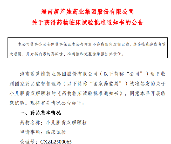 中國粉體網訊 10月27日,ST葫蘆娃發布公告,宣布公司近日已獲得國家藥品監督管理局核準簽發的關于中藥創新藥小兒膽青雙解顆粒的《藥物臨床試驗批準通知書》,該通知書同意小兒膽青雙解顆粒開展臨床試驗。