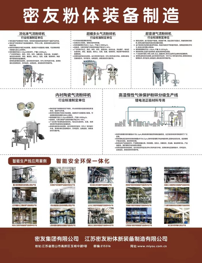 江蘇密友粉體新裝備制造有限公司是密友集團有限公司投資的全資子公司,是一家專業從事粉體裝備制造的研發、制造、銷售為一體的高新技術企業,主營:氣流粉碎機、超細多頭氣流粉碎機、內襯陶瓷氣流粉碎機、符合GMP的氣流粉碎機、惰性氣體氣流粉碎機、高溫惰性氣體保護粉碎分級生產線、有色金屬稀土釹鐵硼專用粉碎分級生產線、WP、WDG、SC、AS智能化農藥生產線、非金屬礦粉體等系列產品。