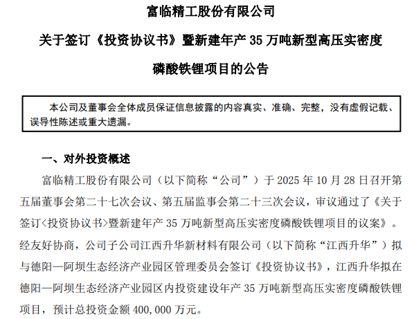 10月29日,富臨精工發(fā)布公告稱,子公司江西升華擬與德陽—阿壩生態(tài)經(jīng)濟(jì)產(chǎn)業(yè)園區(qū)管理委員會簽訂《投資協(xié)議書》,江西升華擬在德陽—阿壩生態(tài)經(jīng)濟(jì)產(chǎn)業(yè)園區(qū)內(nèi)投資建設(shè)年產(chǎn)35萬噸新型高壓實(shí)密度磷酸鐵鋰項目,預(yù)計總投資金額40億元。