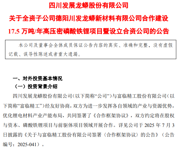 同日,川發(fā)龍蟒披露全資子公司德陽川發(fā)龍蟒新材料有限公司合作建設(shè)17.5萬噸/年高壓實(shí)磷酸鐵鋰項目暨設(shè)立合資公司的公告,四川發(fā)展龍蟒股份有限公司與富臨精工股份有限公司共同簽署了《合作框架協(xié)議》,雙方約定將在股權(quán)與資本、磷酸鐵鋰項目與前驅(qū)體項目領(lǐng)域開展合作。