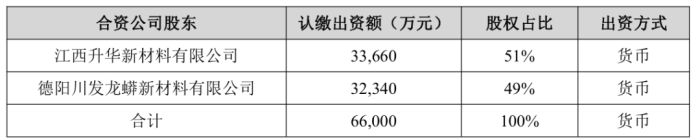 并且,川發(fā)龍蟒與富臨精工擬共同出資設(shè)立合資公司富臨龍蟒新材料有限公司,合資公司設(shè)立時的注冊資本金為人民幣66,000萬元,其中,江西升華出資33,660萬元,占合資公司注冊資本的51%,德陽川發(fā)龍蟒出資32,340萬元,占合資公司注冊資本的49%;并以合資公司為主體開展17.5萬噸/年高壓實(shí)磷酸鐵鋰項目的投資、建設(shè)和運(yùn)營,本項目預(yù)計總投資金額19.61億元,資金來源為合資公司自有及自籌。