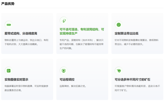 利用光學技術(shù),實現(xiàn)對礦石中雜質(zhì)的快速、識別與分離。適用于各類礦石的精選加工,提高礦石品質(zhì),降低生產(chǎn)成本。