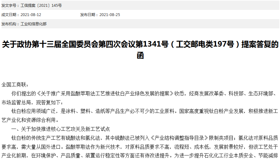 中國粉體網訊 據工業和信息化部8月25日消息,工信部在關于政協第十三屆全國委員會第四次會議第1341號(工交郵電類197號)提案答復的函中指出,下一步,工信部將會同有關部門密切關注鹽酸萃取法鈦白粉工藝技術研發及產業化進展,并對獲得過國家級或省部級科技獎、技術水平成熟可靠、生產過程本質安全、節能減排成效顯著的鈦白粉生產核心工藝,通過印發《石化化工行業鼓勵推廣應用的技術和產品目錄(第一批)》的方式予以推廣應用,相關單位可按有關要求積極申報,穩步推進新工藝試點。
