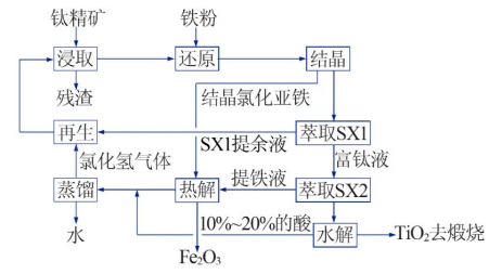 與硫酸法和氯化法相比,鹽酸法鈦白粉具有獨特的優勢。該工藝在鈦白粉制備過程中產生的副產物FeCl2/FeCl3可通過熱水水解轉化為氧化鐵再利用,同時生成的鹽酸可返回鈦白粉生產主線,這就避免了硫酸法生產過程中的副產物硫酸亞鐵無法處理而帶來的環保壓力;鹽酸法可以采用普通鈦鐵礦作為原料進行生產,與對原料要求較高的氯化法相比,在原料選擇方面具有一定的優勢;在鹽酸法鈦白粉生產過程中,鹽酸和萃取劑可循環利用,副產物經過焙燒后可作為煉鐵的原料,這樣能降低鈦白粉的生產成本,同時氯化氫也可回收循環利用。
