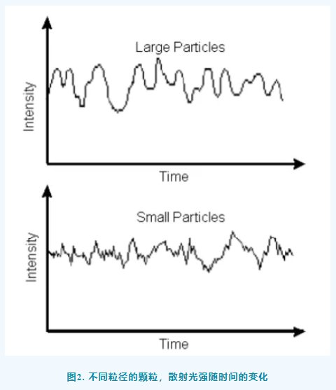 分散在溶液相的納米顆粒由于受到溶劑分子的撞擊,呈現出無規則的運動,我們稱之為布朗運動(Brownian motion),如果我們將一束激光照射至含有該納米顆粒的溶液中,溶液相中的顆粒會產生散射光,隨后在一定的角度收集相關的散射光,我們就能得到如圖2所示的散射光強隨時間的變化曲線,可以看出大顆粒布朗運動較為緩慢,散射光強的變化頻率較慢(圖2,上)。小顆粒則相反,由于其布朗運動劇烈,接收到的散射光強的變化頻率較快(圖2,下)。
