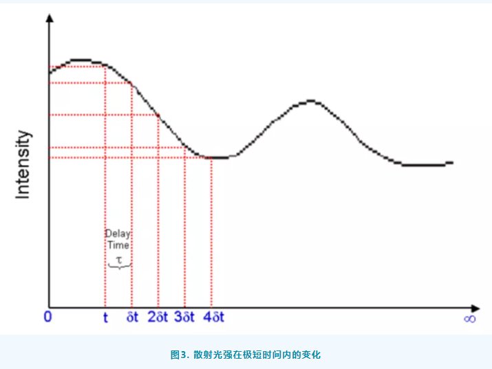 接下來我們要引入“相關性”這個概念,如圖3所示,如果我們將t時刻的散射光強度和其后較長時間的散射光強相比較,顯然,他們沒有什么相關性。但是,當我們將時間縮短至極短時間范圍內,也就是將t和t+δt時刻的光強值進行比較,就能得到很強的相關性,隨著時間的增加(δt, 2δt, 3δt, 等等),其散射光強值和t時刻的相關性不斷衰減,最后接近0值,相關性通常用數值來描述(1→0),數值越靠近“1”代表相關性非常高,越接近“0”代表相關性很低。δt的時間非常短,一般在納秒(nanosecond,ns)或者微秒(microsecond,μs)。