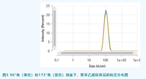 當測試的樣品為粒徑窄分布時,例如聚苯乙烯標準樣品,兩種測量角度都能得到很好的粒徑分布圖,結果也非常一致(圖5)。