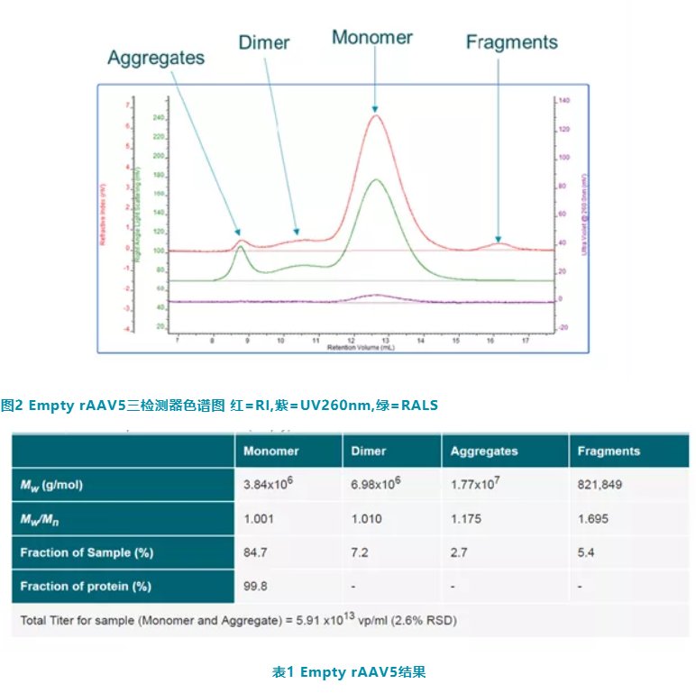 本文通過GPC/SEC和多角度動態光散射(MADLS)兩種分析技術分析rAAV5樣品,展示了快速、準確和可靠地定量測量AAV的病毒滴度(AAV Titer)和實心率(% full AAV)的方法。