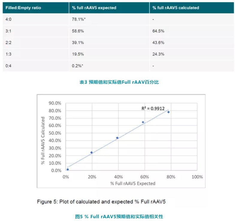另外,本文將Full rAAV5和Empty rAAV5以確定比例混合,來對Full rAAV5樣品進行分析。表3顯示了每個樣品的預期值和實際值Full rAAV百分比。圖5顯示了期望值和實際值之間有很強的相關性,證實了OMNISEC確定樣品實心率結果的可靠性。