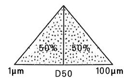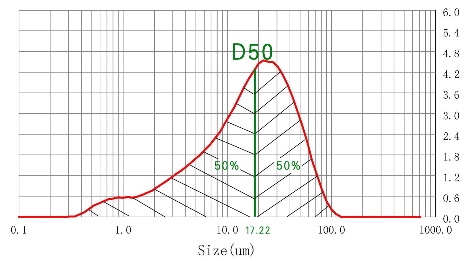 累積分布百分?jǐn)?shù)達到 50%時所對應(yīng)的 粒 徑 值。 D50 又稱中位徑或中值粒徑。假設(shè)一個樣品的 D50=5μm, 說明在組成這個樣品的顆粒中,粒徑大于5μm 的占 50%,小于 5μm 的 顆粒也占 50%。D50 是粉體生產(chǎn)和應(yīng)用中評價粉體粒度的一個典型指標(biāo),通常也用它來代表粉體的平均粒徑。