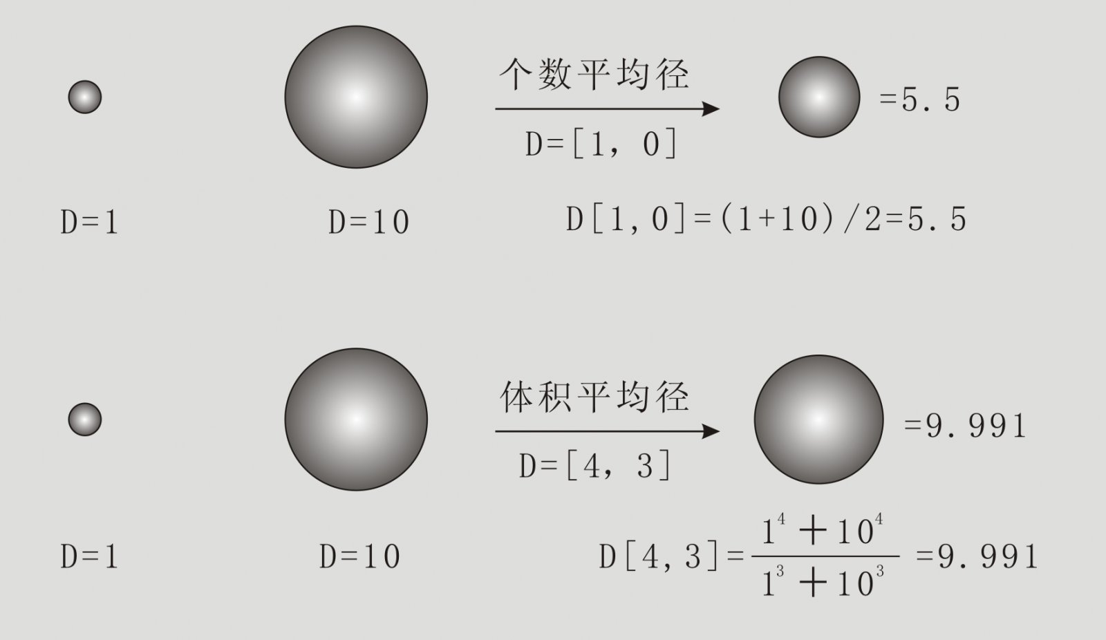 平均徑是表征粉體平均粗細程度的值,有很多計算方法,但究竟哪種計算方法所得到的平均徑更符合實際呢?舉一個簡單的例子,兩個直徑分別為 1 和 10 的球體,如果你僅對數量感興趣,則就簡單計算數量平均直徑,得到的結果是D[1,0]=(1+10)/2=5.5。但是如果你感興趣的是它的體積,而體積是直徑的三次函數,這樣,直徑為 1的球體體積為 1,直徑為 10 的球體體積為 1000。也就是說,大球體占總體積的 99.9%,這時用 D[4,3]能更好地反映顆粒的體積平均徑: