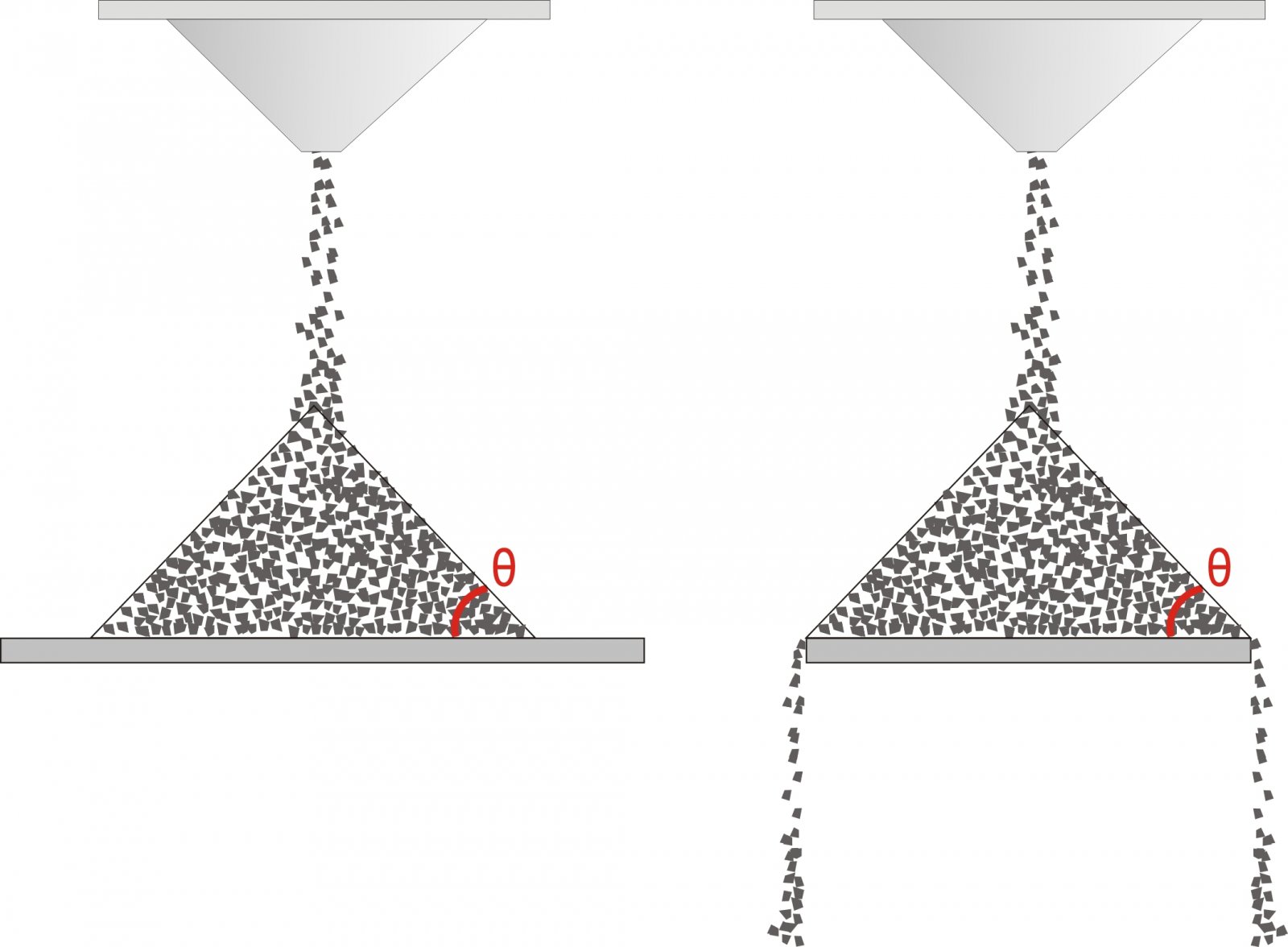 測量安息角有兩種方法,一種是注入角法,指從某一高度粉體注入到大的平板上所形成的錐體斜面的角度。另一種是排出角法,指將粉體注入到較小直徑的圓板上后當(dāng)粉體堆積到圓板的邊緣時,粉體開始從邊緣排出,此時圓板上粉體形成的堆積角為排出角。由于排除角法體積較小,操作簡便,因此實(shí)際測量安息角時常用排除角法。排除角法所用的的圓板直徑尺寸一般在80mm左右。