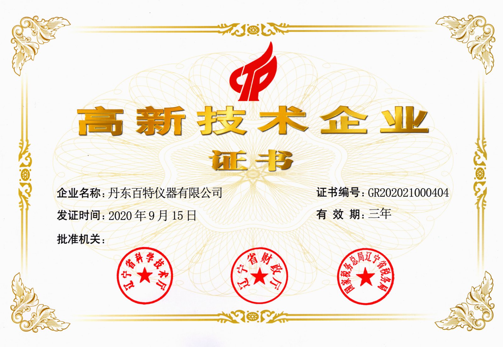 近日,經企業申報、專家評審、遼寧省認定機構審核并經國家科技部備案、公示等程序,百特獲得了由遼寧省科學技術廳、遼寧省財政廳和國家稅務總局遼寧省稅務局聯合頒發的“高新技術企業”證書,證書編號為GR202021000404,有效期三年。這是百特繼2007年獲得高企認證后,連續15年獲得國家高企有效資質證書。