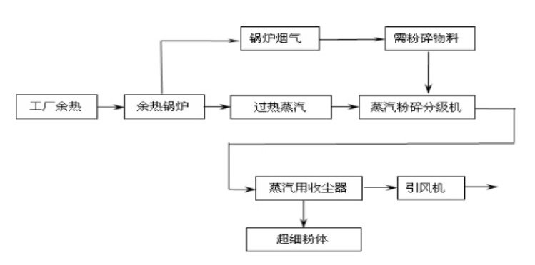 項目系統采用的余熱鍋爐是對工業余熱利用方式的一種全新的途徑,項目有機的將工業余熱和超細粉體材料加工整合為一體,不但充分的發揮了氣流粉碎的優點,降低了氣流粉碎的中成本問題;同時尋求出了工業余熱利用的一種新方法,提高工業企業余熱的經濟價值;再者拓寬粉碎加工的物料范圍,可廣泛應用于水泥、鋼鐵、玻璃、化工、熱電等余熱產量大的行業。項目產品利用工業余熱制備超細粉體的工藝流程: