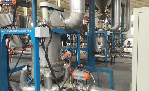 ②.粉碎后的物料通過螺旋輸送機進入整形機進行整形和分級,整形機設計為兩連機,整形主機采用變頻調速,可跟據情況調節整形的時間;分級機可跟據要求調節不同的粒度。整形機采用合金化錘頭,耐磨陶瓷襯板,能有效保證產品的純度。