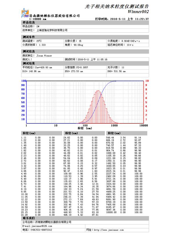 本次試驗(yàn)使用的winner802基于動(dòng)態(tài)光散射原理的納米激光粒度儀,測(cè)試范圍1-10000nm,測(cè)試報(bào)告如下: