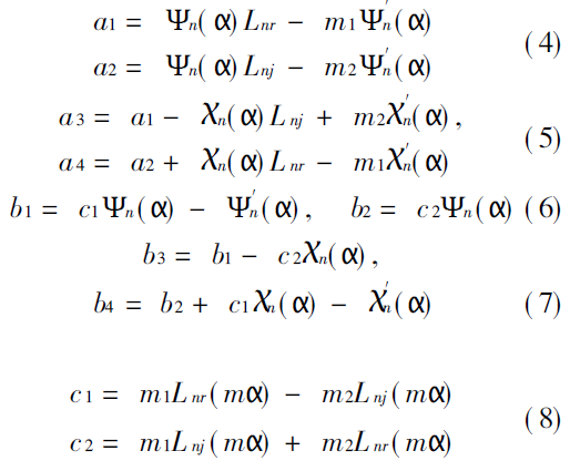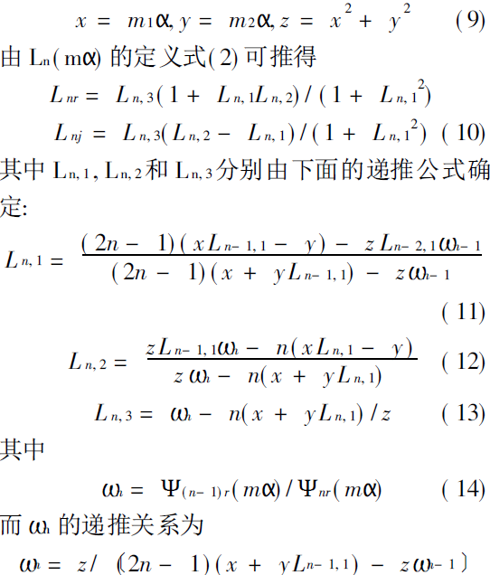 其中Lnr、Lnj分別表示Ln(m)的實部與虛部。將(2)式代入(1)式,并用anr、anj和bnr、bnj分別表示的實部與虛部。如此可推得