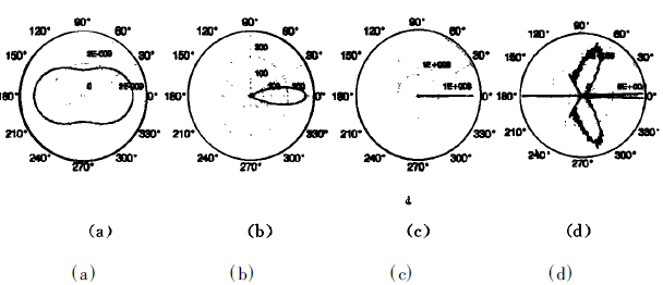 圖1示出散射光強的一組計算實例。其中取m1=1.33,m2=-0.4,λ=0.6328三圖分別對應于顆粒的直徑為d=0.001,1.0和30μm。而d圖為顆粒直徑d=100μm時散射花樣的局部放大。可見,隨著顆粒尺寸的增大,前向散射迅速加強,并且出現了復雜的旁瓣。