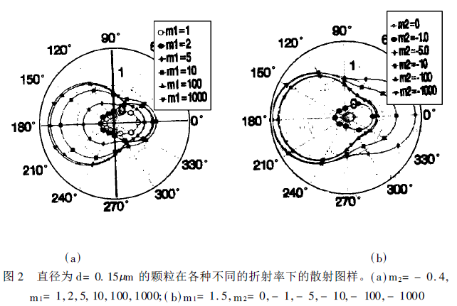 實部(a)與虛部(b)的變化情況。可見隨著m1和m2的增大,雖然顆粒的尺寸保持不變,但散射也加強,且后向散射隨著m1和m2的增大而加強。