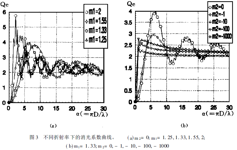 圖3給出有關消光系數的計算結果,其中a)和b)分別表示消光系數隨折射率實部與虛部的變化情況。可見隨著顆粒直徑的增大,消光系數趨近于2; 折射率的增大,尤其是折射率虛部的增大,使這一趨近變得更快和更明顯。另外當折射率的虛部m2= 0時,消光系數隨顆粒直徑的增大而振蕩;但當m2≠0 時,振蕩迅速消失。