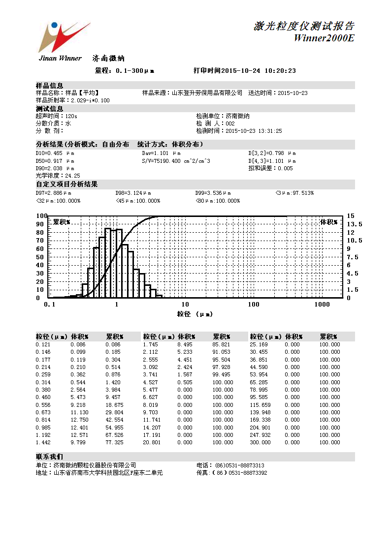 由于顆粒的粒度與形狀對其產品的性質與用途影響很大,不同的測量方法適用于不同的粒度范圍,由于采用了不同的原理,對于同一樣品的檢測結果在數(shù)據(jù)上會有偏差,目前工廠常用的分析方法已經普遍使用激光粒度儀進行檢測。以下是使用winner2000E檢測的鈦白粉粒度,測試報告如下: