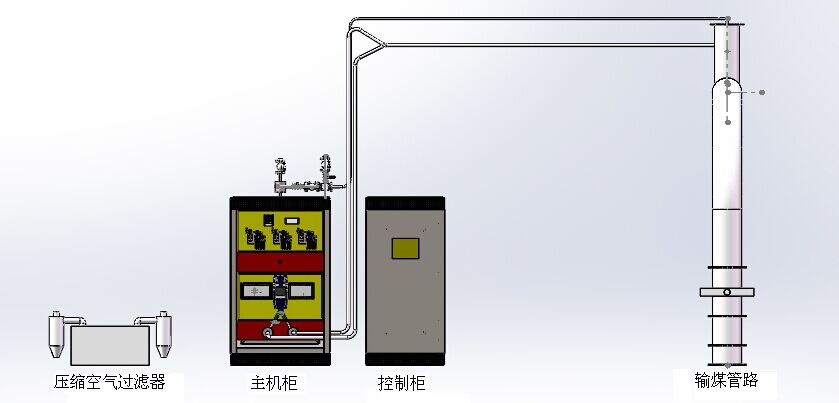 本系統采用取樣式測試,從煤粉管道中取出樣品,測試完成后把煤粉送回煤粉管道,形成閉合回路。只需要在管道測點開一個50mm的孔,焊接上法蘭,安裝取樣器。在離主機測試柜最近的煤粉管路上開一個50mm的孔,焊接上法蘭,用于煤粉測試完成后的回樣點。